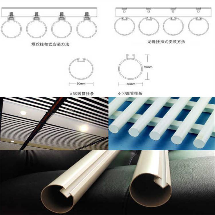 4.铝圆管天花通透的装置方法,装拆简易便利 产品使得室内空间作用更具有敞开的视野、通风、透气、线条规整、层次分明,体现了简约明晰的现代风格,装置拆卸简单便利。