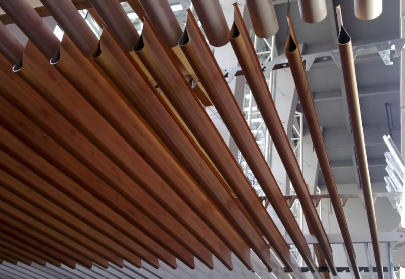 同时使用铝挂片天花的这一种装饰天幕吊顶,能够做到线条明快飘逸,整体通透、祥和、色彩丰富,具有更强的立体感和开放感。